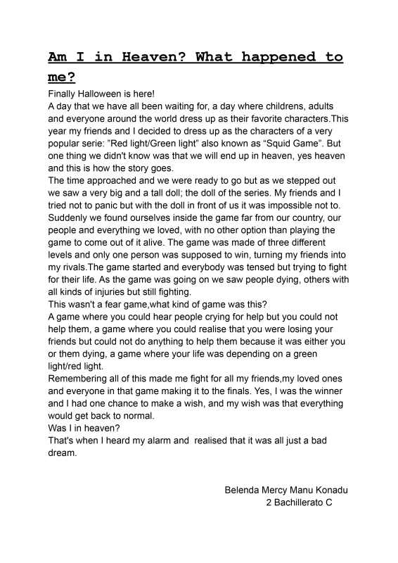 Ya hay resultado del 2º Concurso de Relatos de Terror: el relato Am I in Heaven? What happened to me? de la alumna de 2º Bachillerato C, Belenda Mercy Manu Konadu, ha sido el ganador en la categoría Senior; en la categoría Junior, la ganadora ha sido la alumna de 2º ESO C, Nourhan Chenine Khantache, con The Mysterious Mansion. A continuación, las obras premiadas.