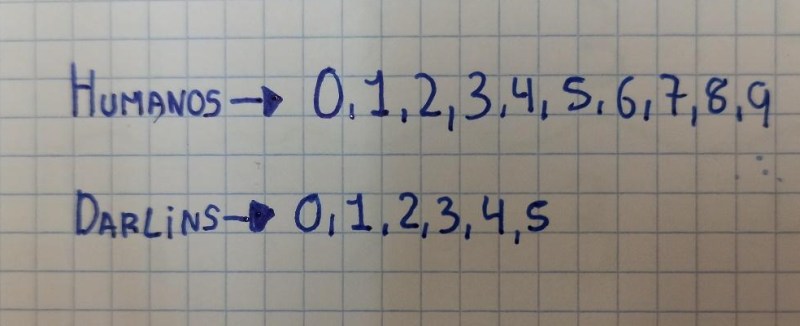 Los humanos empleamos diez cifras para escribir números (0, 1, 2, 3, 4, 5, 6, 7, 8 y 9) porque tenemos diez dedos. Pero los derlins tienen solo seis dedos, por lo que solo emplean seis cifras: 0, 1, 2, 3, 4 y 5.