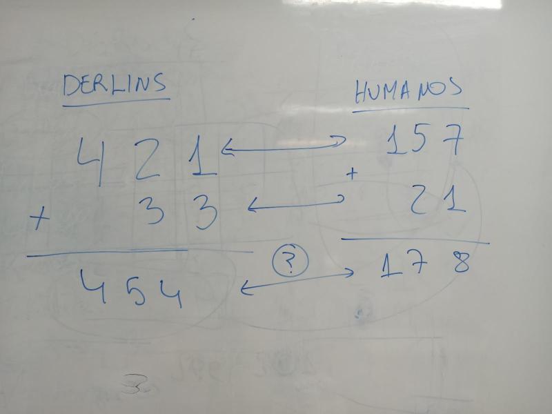 Hasta aquí parece fácil, pero… ¿cómo suman los derlins? ¿Sirven las mismas reglas que las que usamos los humanos? Pues la respuesta es SÍ. Lina ha hecho esta suma de ejemplo para que veamos que funciona igual.