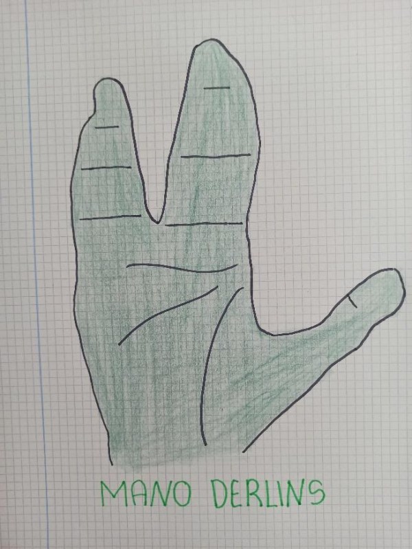 A diferencia de los seres humanos, los DERLINS tienen solo 6 dedos en las manos (tres dedos en cada una), por lo que en vez de contar de 10 en 10 cuentan de 6 en 6. Si queréis haceros una idea de cómo son los derlins, aquí tenéis este dibujo que ha hecho Muhammad de una de sus manos.