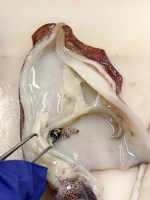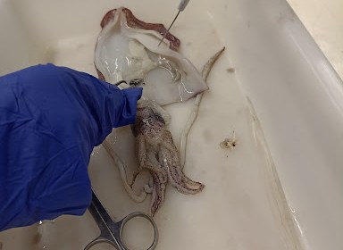 La primera quincena de febrero hemos tenido la oportunidad de hacer prácticas de laboratorio con animales reales. En este caso hemos aprendido la anatomía de los moluscos cefalópodos diseccionando un calamar. Para ello hemos usado el siguiente material: guantes, pinzas, tijeras de laboratorio y bisturí.