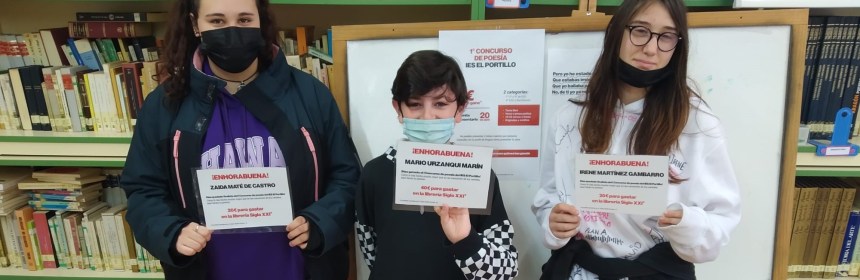 Nuestros alumnos Mario Urzanqui (Primer premio), Zaida Maté e Irene Martínez (Accésits) han resultado ganadores del I Concurso de poesía IES El Portillo. A continuación, los poemas galardonados e imágenes de la entrega del premio con el que conmemoramos en nuestro centro el Día del Libro.
