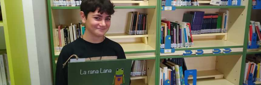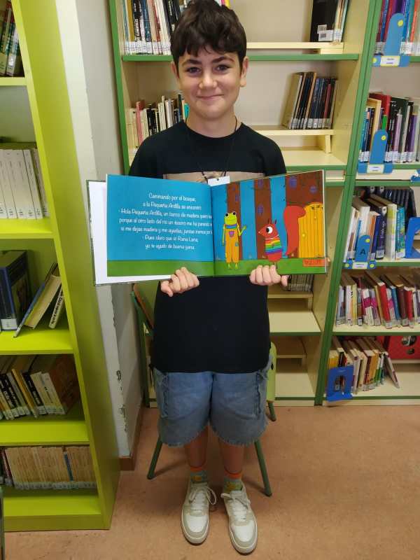 Mario con su libro, La rana Lana, en la biblioteca del IES El Portillo.