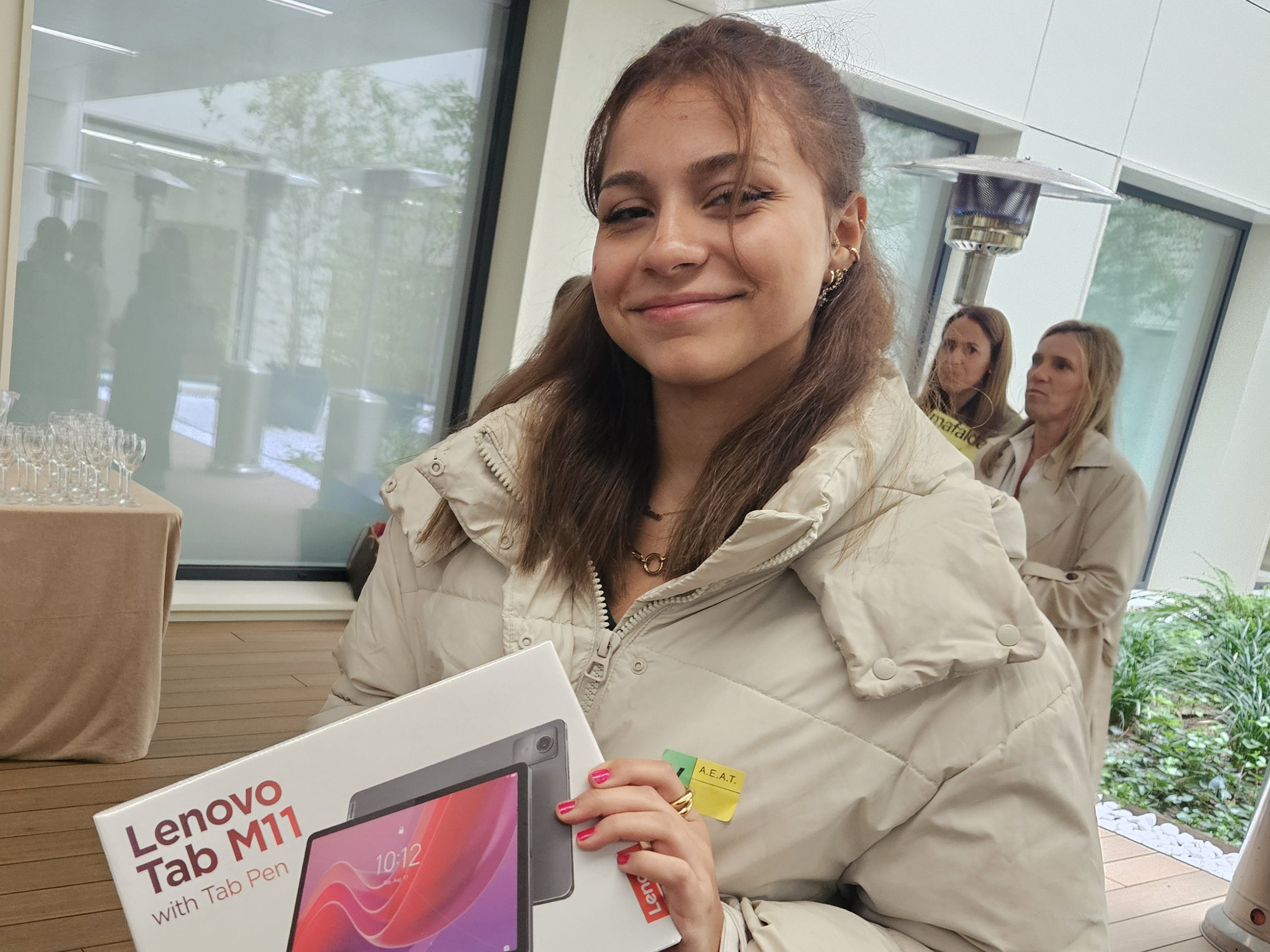 Sara, sosteniendo el premio obtenido en el concurso nacional, una tablet.